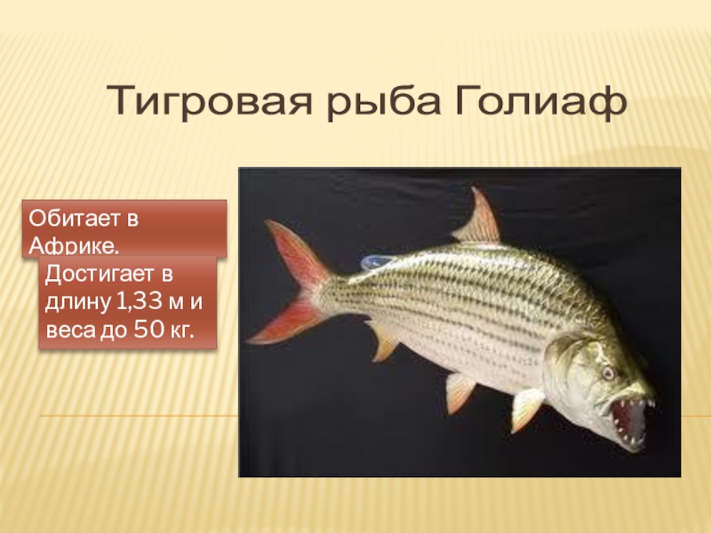 Тигровая рыба ГолиафОбитает в Африке.Достигает в длину 1,33 м и веса до 50 кг.