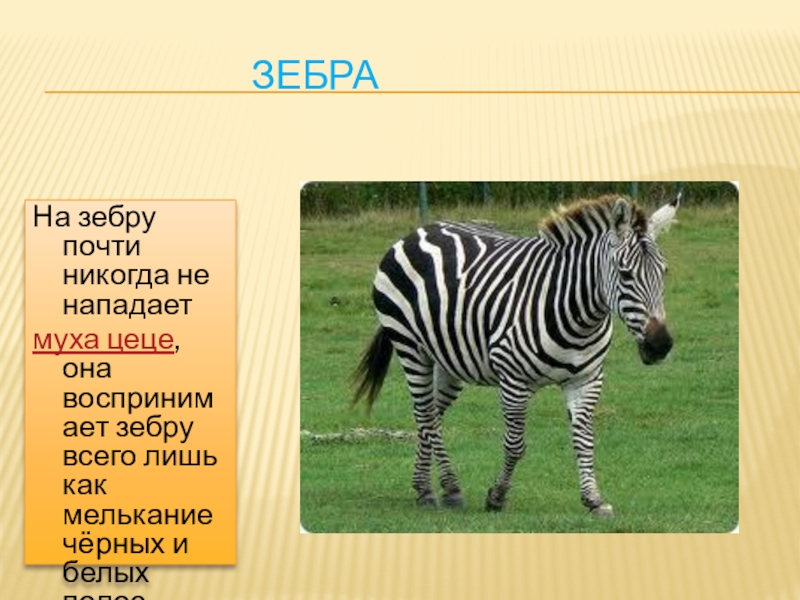 зебраНа зебру почти никогда не нападает муха цеце, она воспринимает зебру всего лишь как мелькание чёрных и белых