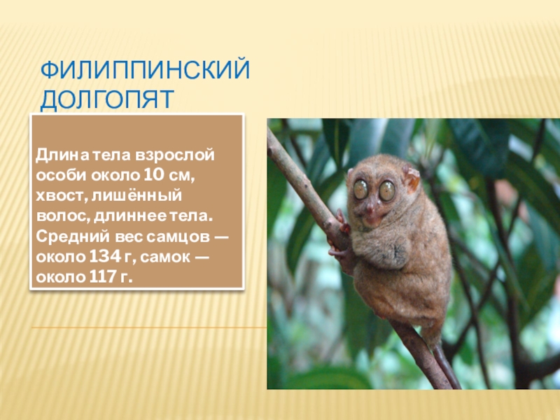 Филиппинский долгопят Длина тела взрослой особи около 10 см, хвост, лишённый волос, длиннее тела. Средний вес самцов — около