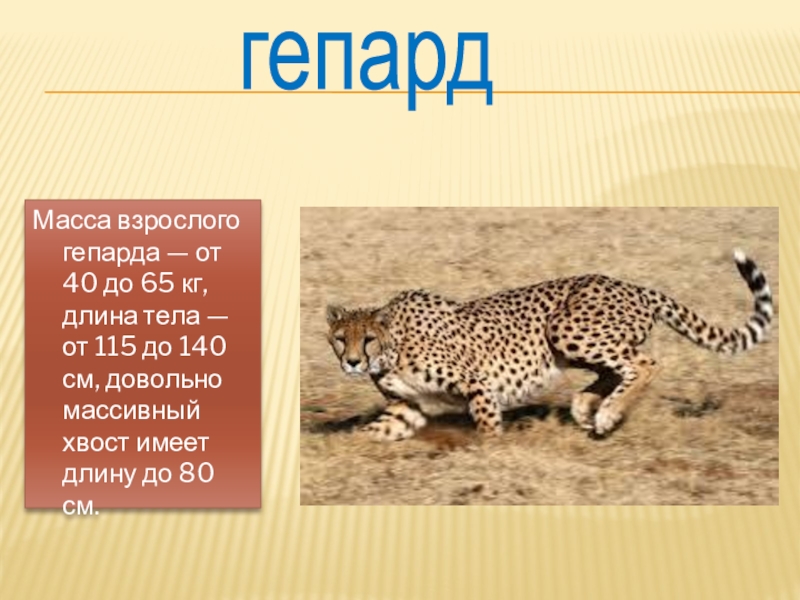 гепардМасса взрослого гепарда — от 40 до 65 кг, длина тела — от 115 до 140 см,