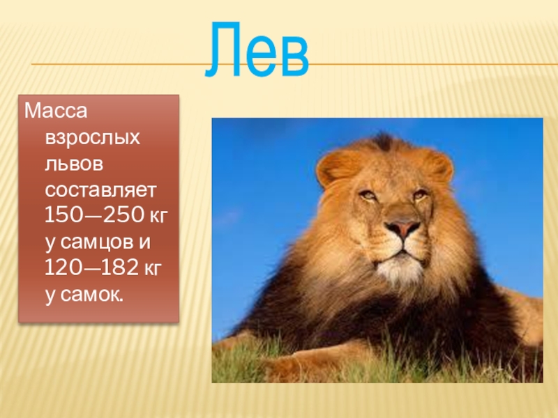 ЛевМасса взрослых львов составляет 150—250 кг у самцов и 120—182 кг у самок.