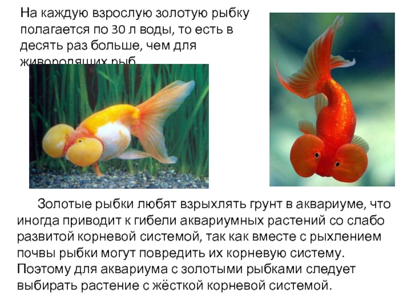 Золотые рыбки любят взрыхлять грунт в аквариуме, что иногда приводит к гибели аквариумных растений со слабо развитой корневой системой, так как вместе с рыхлением почвы рыбки могут повредить их корневую систему. Поэтому для аквариума с золотыми рыбками следует выбирать растение с жёсткой корневой системой.