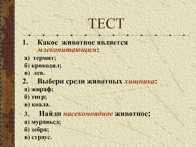ТЕСТКакое животное является млекопитающим:а) термит;б) крокодил;в) лев.Выбери среди животных хищника:а) жираф;б) тигр; в) коала.3.   Найди