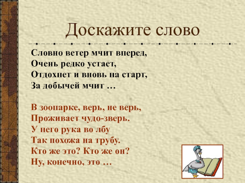 Доскажите словоСловно ветер мчит вперед,Очень редко устает,Отдохнет и вновь на старт,За добычей мчит …В зоопарке, верь, не