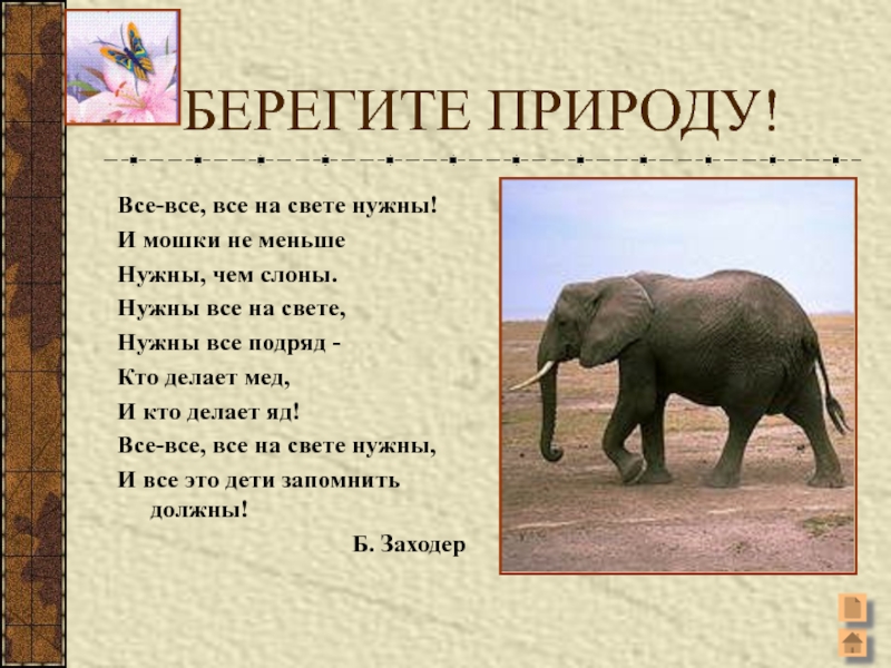 БЕРЕГИТЕ ПРИРОДУ!Все-все, все на свете нужны!И мошки не меньшеНужны, чем слоны.Нужны все на свете,Нужны все подряд -