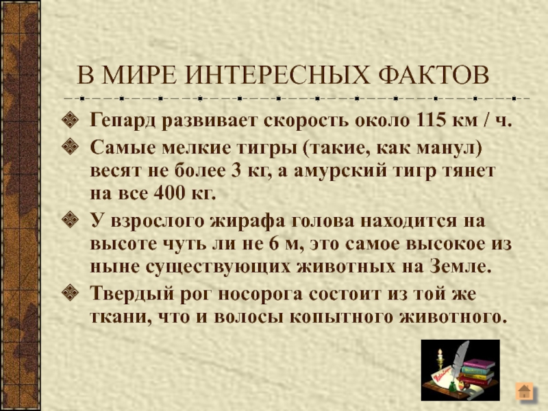 В МИРЕ ИНТЕРЕСНЫХ ФАКТОВГепард развивает скорость около 115 км / ч.Самые мелкие тигры (такие, как манул) весят