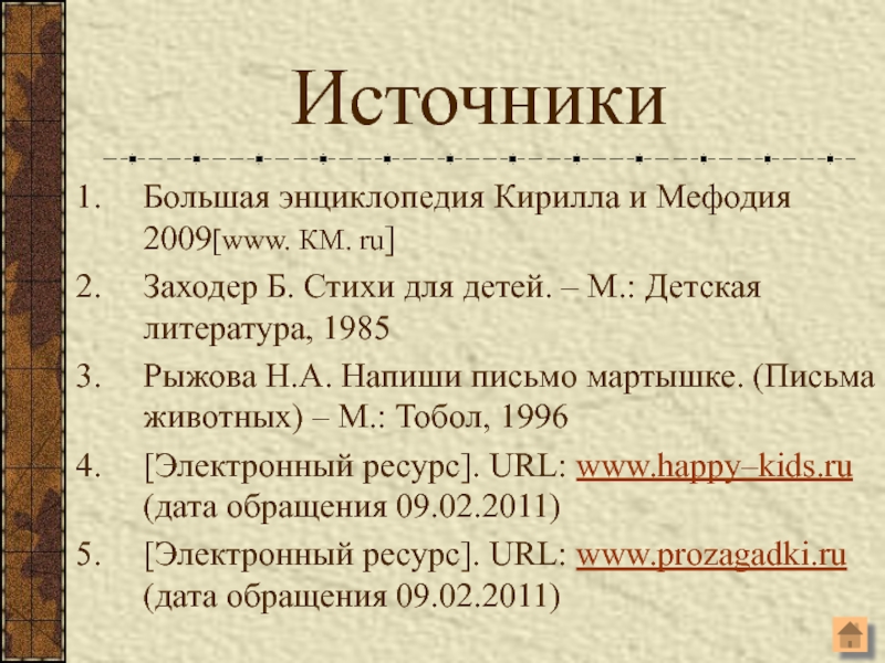 ИсточникиБольшая энциклопедия Кирилла и Мефодия 2009[www. КМ. ru]Заходер Б. Стихи для детей. – М.: Детская литература, 1985Рыжова