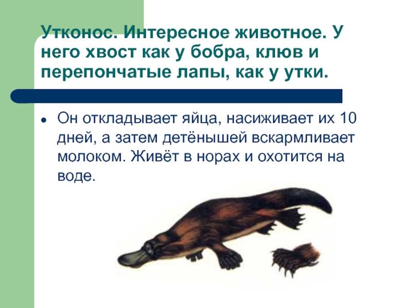 Он откладывает яйца, насиживает их 10 дней, а затем детёнышей вскармливает молоком. Живёт в норах и охотится на воде.
