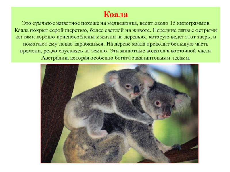 15 килограммов. Коала покрыт серой шерстью, более светлой на животе. Передние лапы с острыми когтями хорошо приспособлены к жизни на деревьях, которую ведет этот зверь, и помогают ему ловко карабкаться. На дереве коала проводит большую часть времени, редко спускаясь на землю. Эти животные водятся в восточной части Австралии, которая особенно богата эвкалиптовыми лесами.