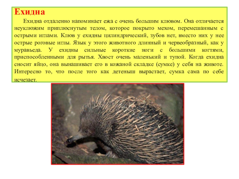 Она отличается неуклюжим приплюснутым телом, которое покрыто мехом, перемешанным с острыми иглами. Клюв у ехидны цилиндрический, зубов нет, вместо них у нее острые роговые иглы. Язык у этого животного длинный и червеобразный, как у муравьеда. У ехидны сильные короткие ноги с большими когтями, приспособленными для рытья. Хвост очень маленький и тупой. Когда ехидна сносит яйцо, она вынашивает его в кожаной складке (сумке) у себя на животе. Интересно то, что после того как детеныш вырастает, сумка сама по себе исчезает.