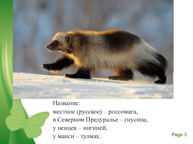 Название: местное (русское) – россомага, в Северном Предуралье – гнусина, у ненцев – ингиней, у манси –