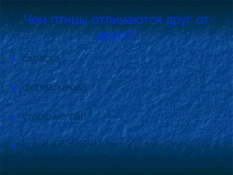 Чем птицы отличаются друг от друга?окраскаформа клювастроение лапстроение туловища