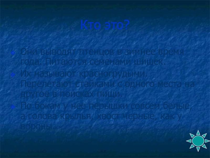 Кто это?Они выводят птенцов в зимнее время года. Питаются семенами шишек.Их называют красногрудыми. Перелетают стайками с одного
