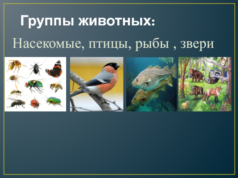 Группы животных:Насекомые, птицы, рыбы , звери