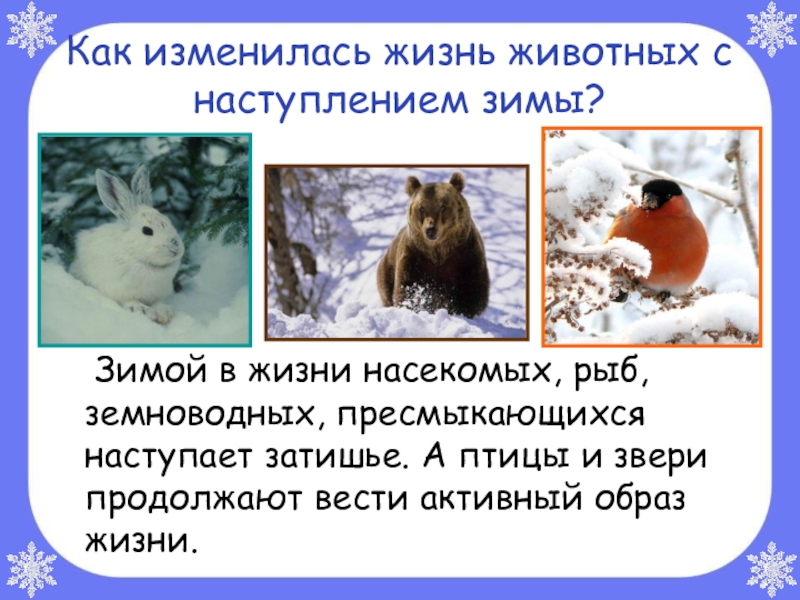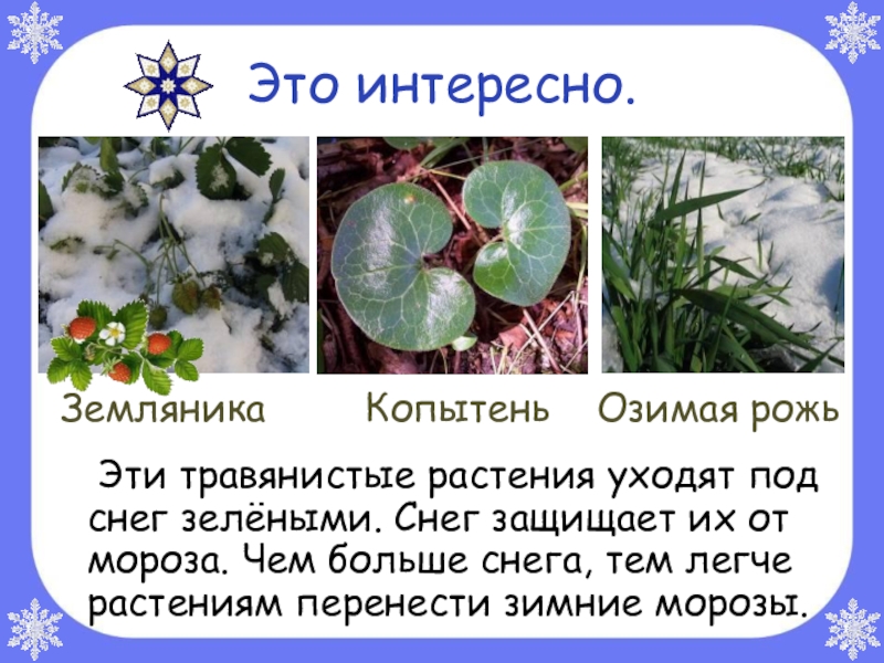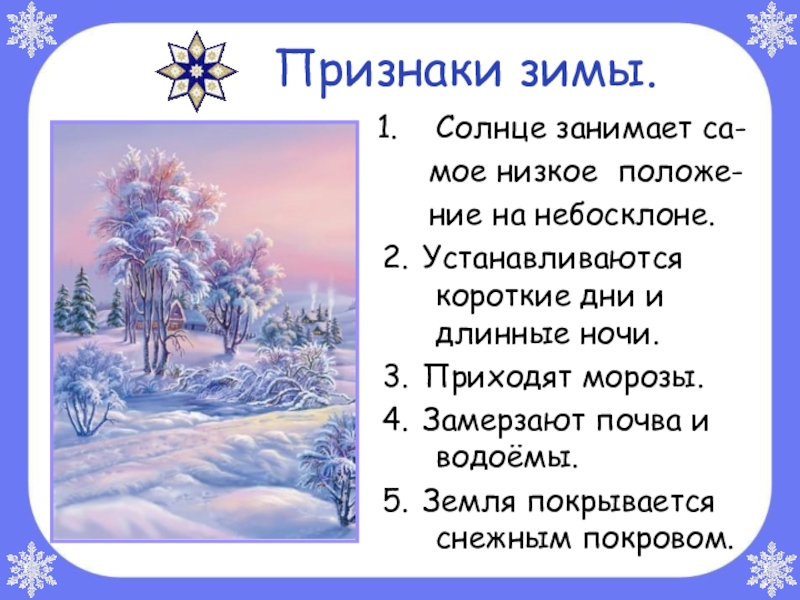 Зима – период покоя в жизни растений. Лиственные деревья и кустарники сбро-сили листву. Хвойные – стоят зелёные. Травы желтеют.