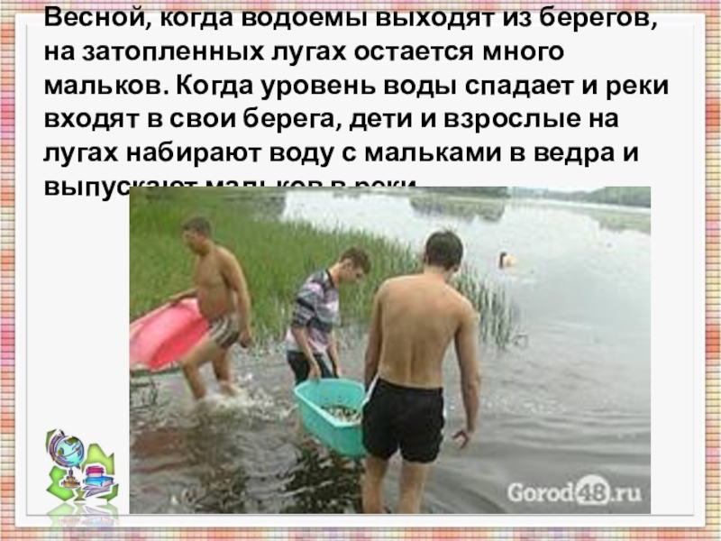 мальков. Когда уровень воды спадает и реки входят в свои берега, дети и взрослые на лугах набирают воду с мальками в ведра и выпускают мальков в реки.