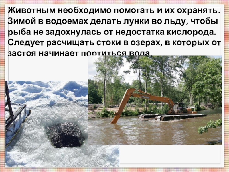 Животным необходимо помогать и их охранять. Зимой в водоемах делать лунки