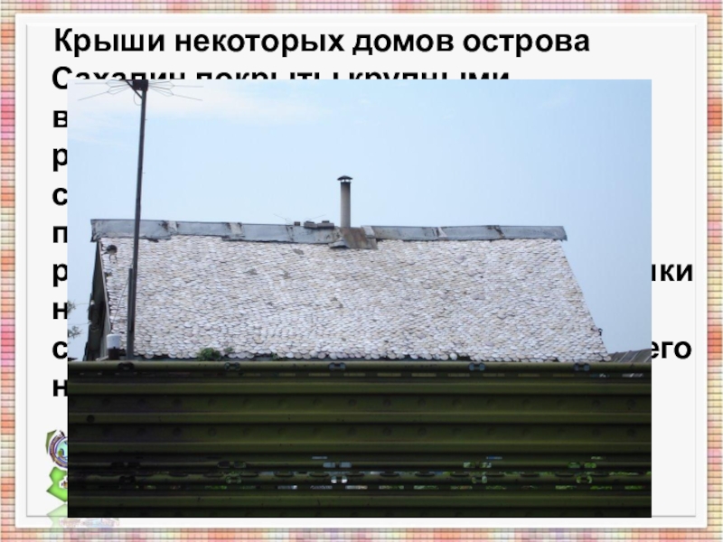 Слайд 5 Крыши некоторых домов острова Сахалин покрыты крупными, величиной с