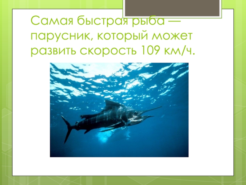Слайд 13Самая быстрая рыба — парусник, который может развить скорость 109 км/ч.