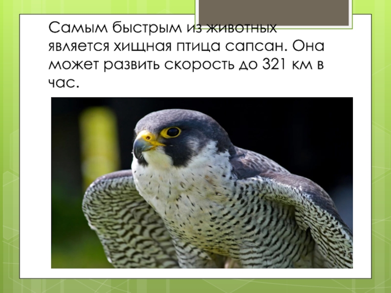 Слайд 21Самым быстрым из животных является хищная птица сапсан. Она может развить