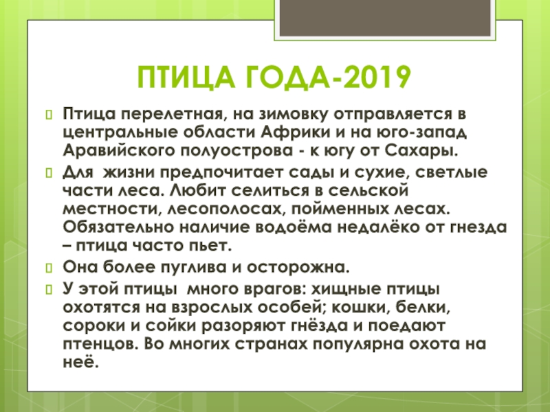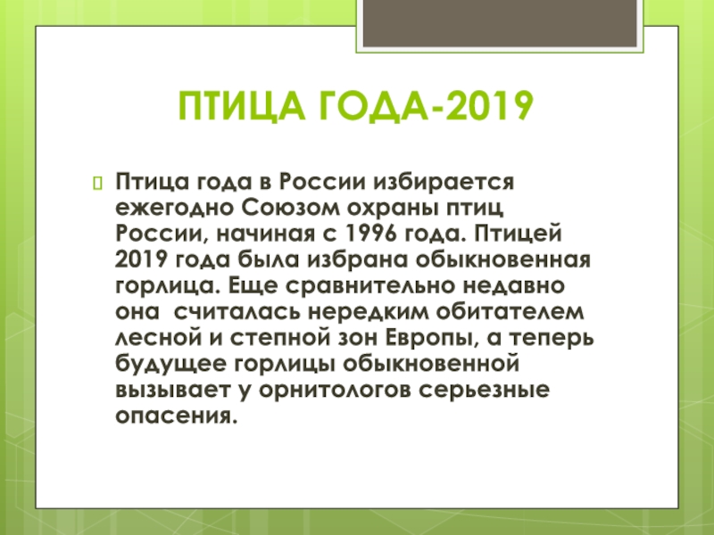 России, начиная с 1996 года. Птицей 2019 года была избрана обыкновенная горлица. Еще сравнительно недавно она считалась нередким обитателем лесной и степной зон Европы, а теперь будущее горлицы обыкновенной вызывает у орнитологов серьезные опасения.