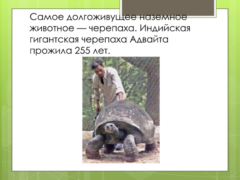 Слайд 17Самое долгоживущее наземное животное — черепаха. Индийская гигантская черепаха Адвайта прожила