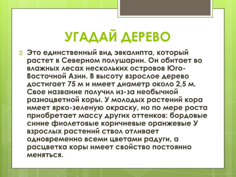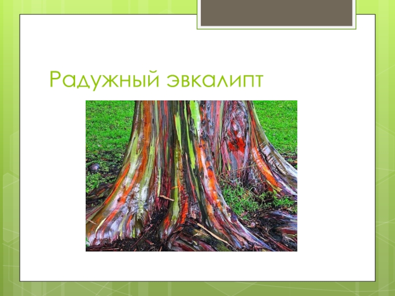 обитает во влажных лесах нескольких островов Юго-Восточной Азии. В высоту взрослое дерево достигает 75 м и имеет диаметр около 2,5 м. Свое название получил из-за необычной разноцветной коры. У молодых растений кора имеет ярко-зеленую окраску, но по мере роста приобретает массу других оттенков: бордовые синие фиолетовые коричневые оранжевые У взрослых растений ствол отливает одновременно всеми цветами радуги, а расцветка коры имеет свойство постоянно меняться.