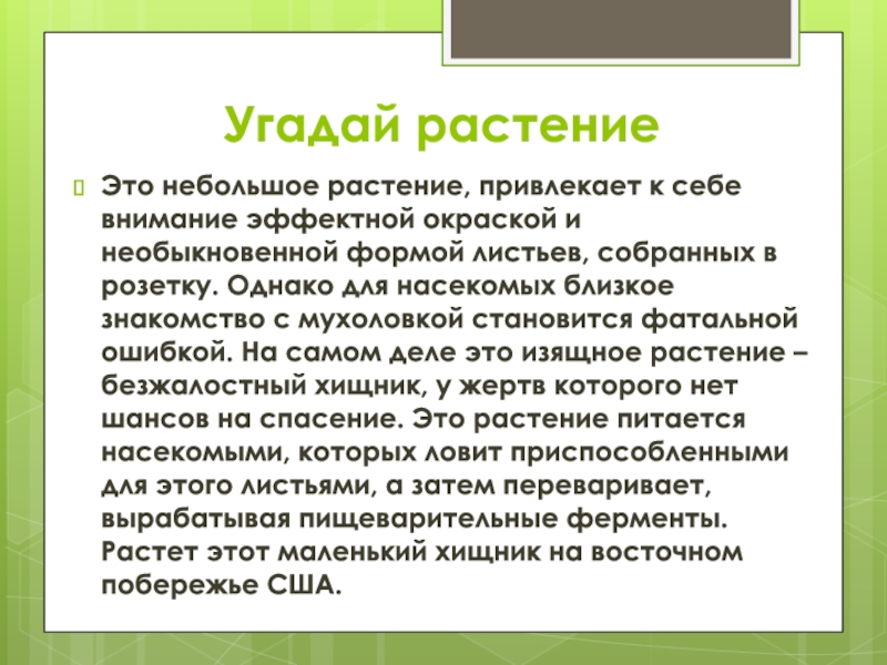 необыкновенной формой листьев, собранных в розетку. Однако для насекомых близкое знакомство с мухоловкой становится фатальной ошибкой. На самом деле это изящное растение – безжалостный хищник, у жертв которого нет шансов на спасение. Это растение питается насекомыми, которых ловит приспособленными для этого листьями, а затем переваривает, вырабатывая пищеварительные ферменты. Растет этот маленький хищник на восточном побережье США.