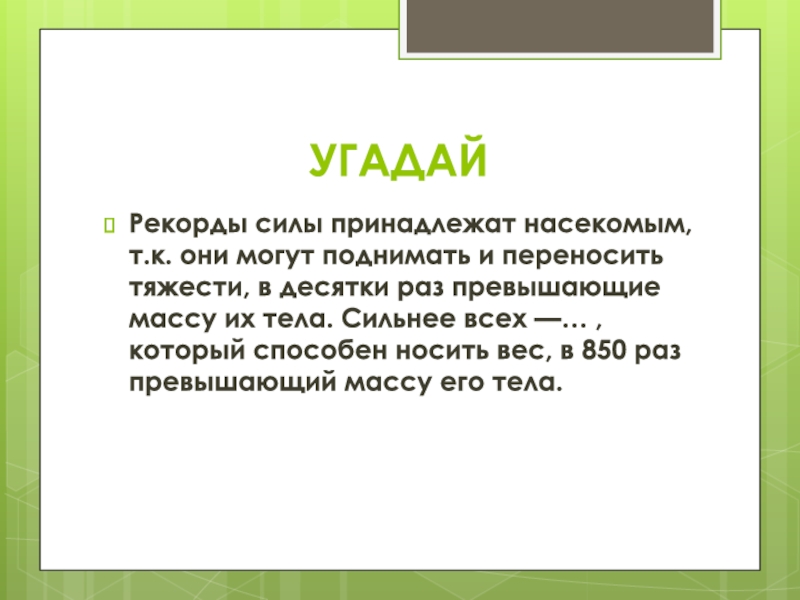 Слайд 15Рекорды силы принадлежат насекомым, т.к. они могут поднимать и переносить тяжести,