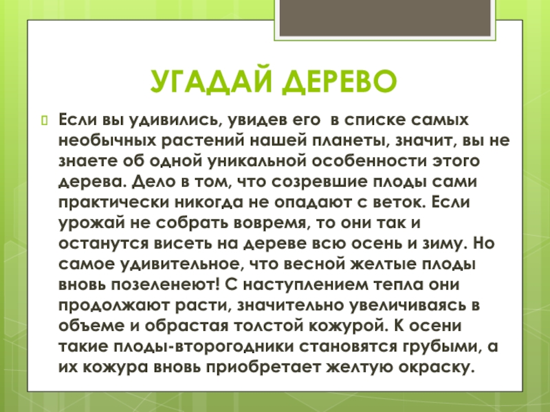 нашей планеты, значит, вы не знаете об одной уникальной особенности этого дерева. Дело в том, что созревшие плоды сами практически никогда не опадают с веток. Если урожай не собрать вовремя, то они так и останутся висеть на дереве всю осень и зиму. Но самое удивительное, что весной желтые плоды вновь позеленеют! С наступлением тепла они продолжают расти, значительно увеличиваясь в объеме и обрастая толстой кожурой. К осени такие плоды-второгодники становятся грубыми, а их кожура вновь приобретает желтую окраску.