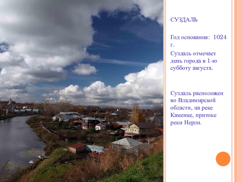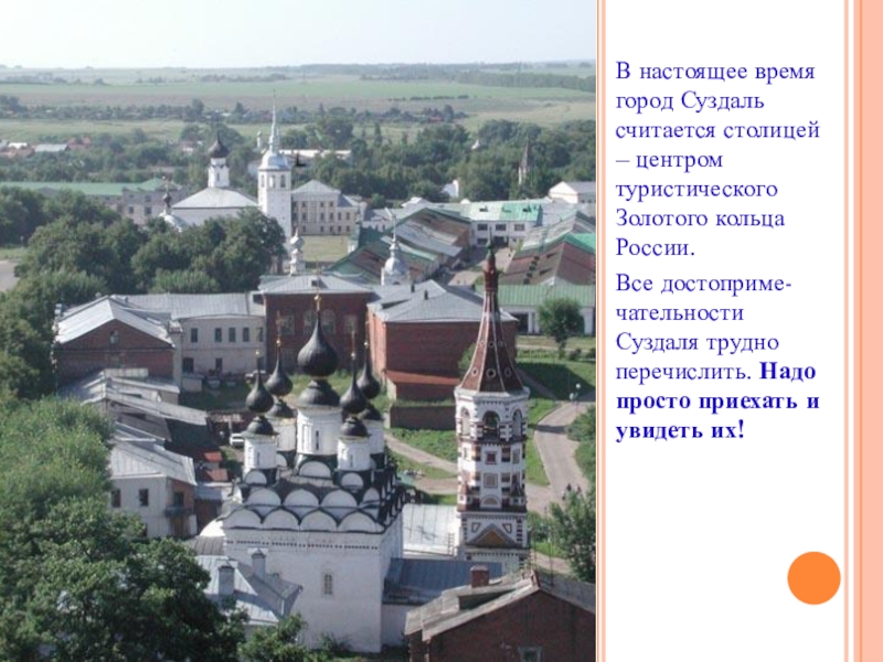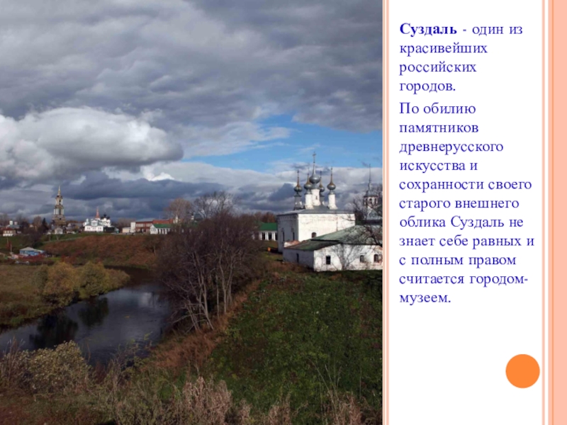 Суздальский музей деревянного зодчества и крестьянского быта расположен у реки, на месте где стоял Дмитриевский монастырь (XI век) – самый первый основанный в городе. Ансамбль музея составляют свезенные в Суздаль из разных мест Владимирщины наиболее интересные культовые и хозяйственные деревянные постройки.