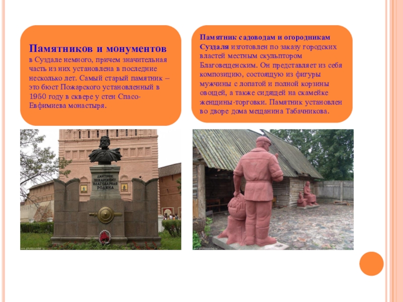 Памятник садоводам и огородникам Суздаля изготовлен по заказу городских властей местным скульптором Благовещенским. Он представляет из себя композицию, состоящую из фигуры мужчины с лопатой и полной корзины овощей, а также сидящей на скамейке женщины-торговки. Памятник установлен во дворе дома мещанина Табачникова.
