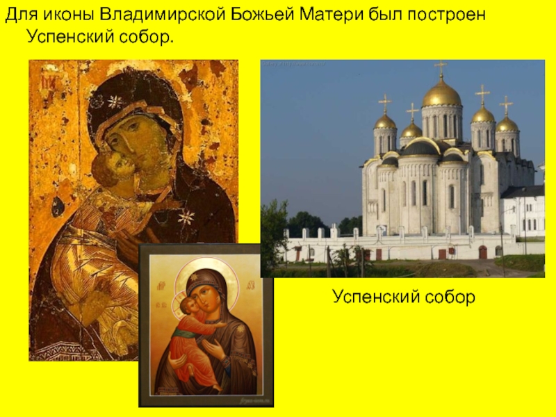 Слайд 16Для иконы Владимирской Божьей Матери был построен Успенский собор.