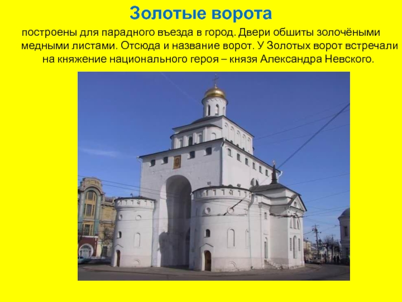 листами. Отсюда и название ворот. У Золотых ворот встречали на княжение национального героя – князя Александра Невского.