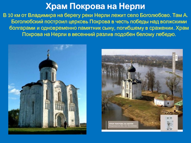 Нерли лежит село Боголюбово. Там А. Боголюбский построил церковь Покрова в честь победы над волжскими болгарами и одновременно памятник сыну, погибшему в сражении. Храм Покрова на Нерли в весенний разлив подобен белому лебедю.