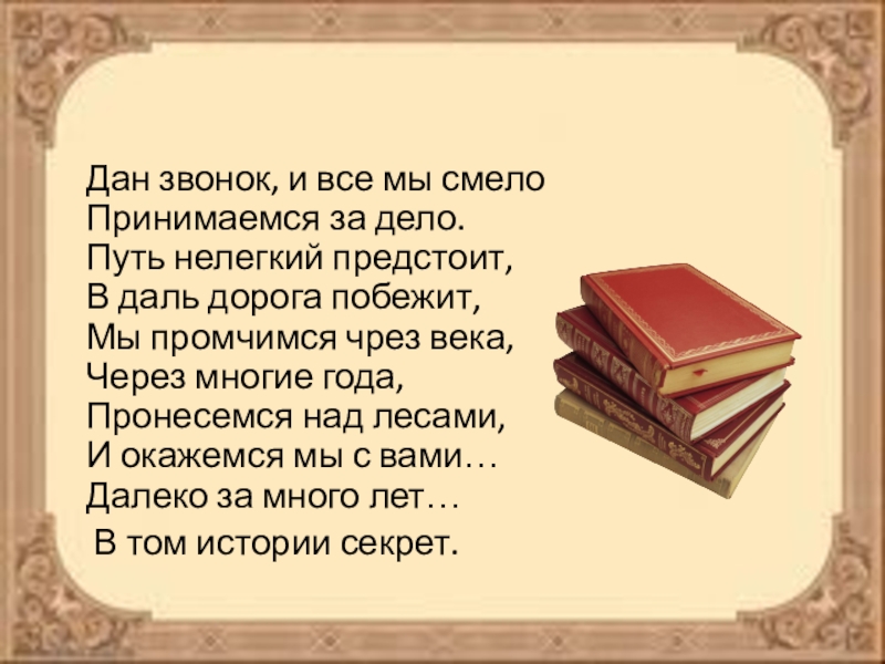Дан звонок, и все мы смело Принимаемся за дело. Путь нелегкий предстоит, В даль дорога побежит, Мы промчимся чрез века, Через многие года, Пронесемся над лесами, И окажемся мы с вами… Далеко за много