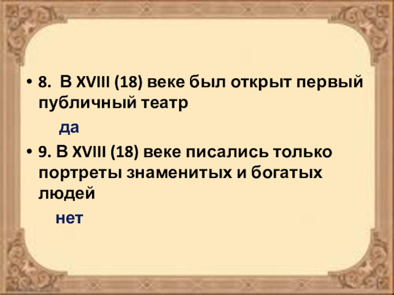 8. В XVIII (18) веке был открыт первый публичный театр     да9. В XVIII