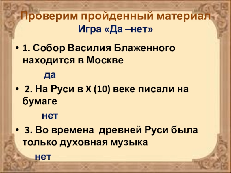 Проверим пройденный материал Игра «Да –нет»  1. Собор Василия Блаженного находится в Москве