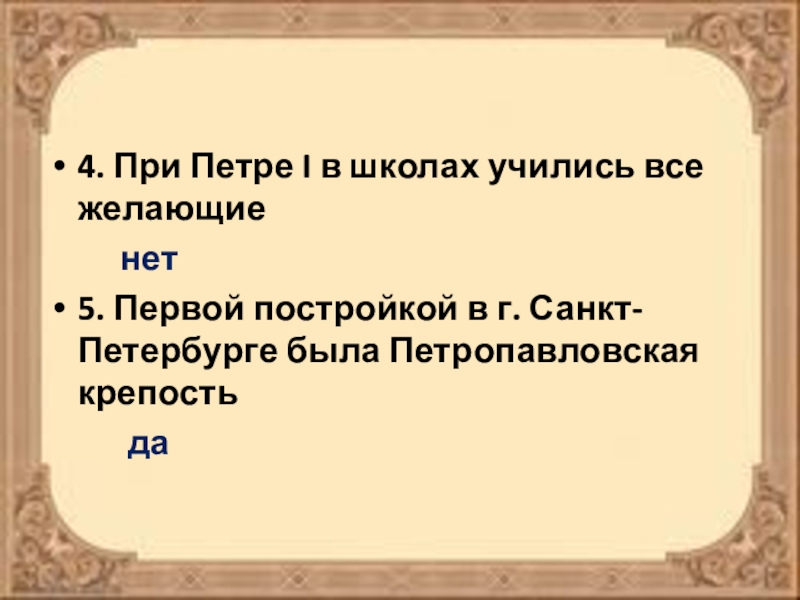 4. При Петре I в школах учились все желающие     нет5. Первой постройкой в