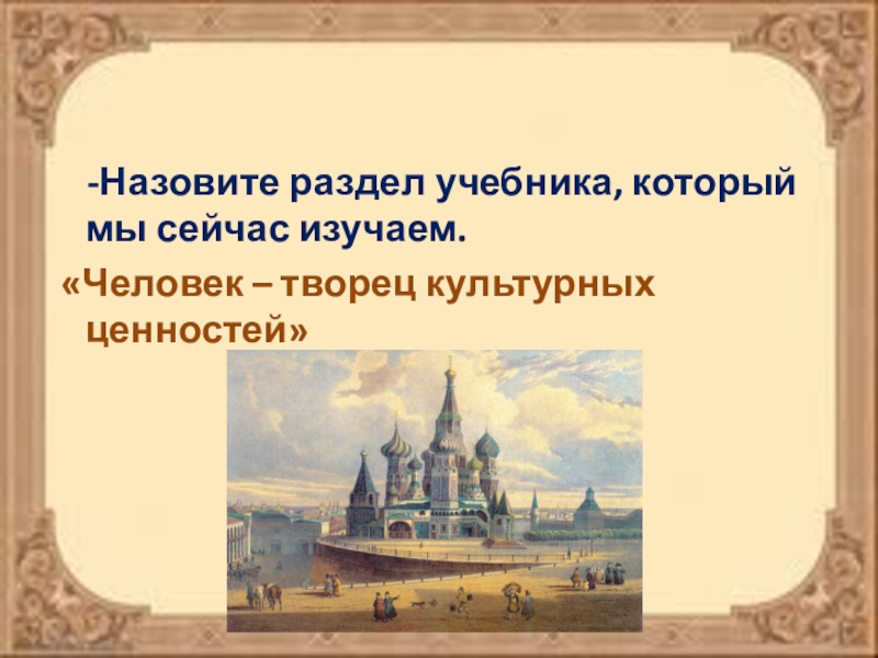 -Назовите раздел учебника, который мы сейчас изучаем. «Человек – творец культурных ценностей»