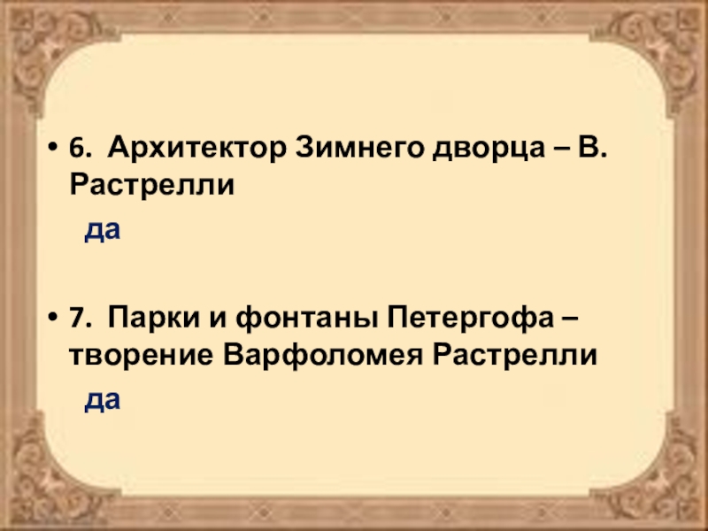 6. Архитектор Зимнего дворца – В. Растрелли   да7.  Парки и фонтаны Петергофа – творение Варфоломея
