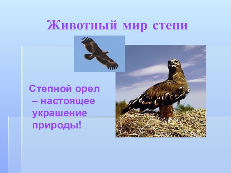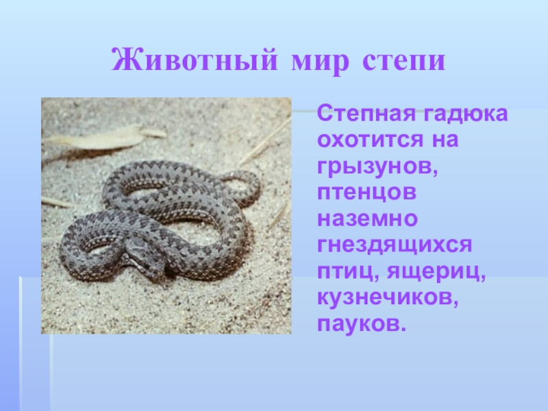 Животный мир степи  Степная гадюка охотится на грызунов, птенцов наземно гнездящихся птиц, ящериц, кузнечиков, пауков.