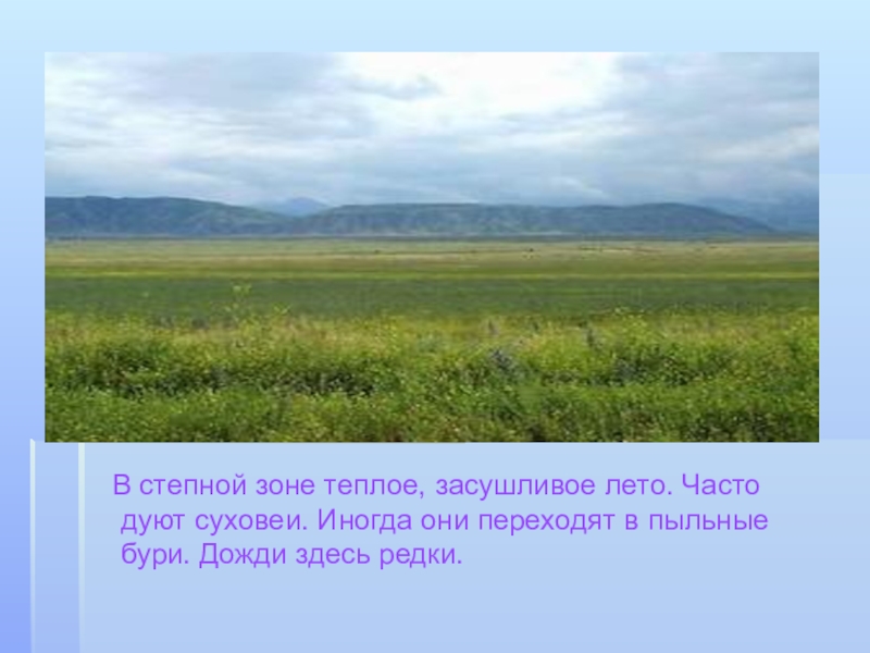 Слайд 3 В степной зоне теплое, засушливое лето. Часто дуют суховеи.
