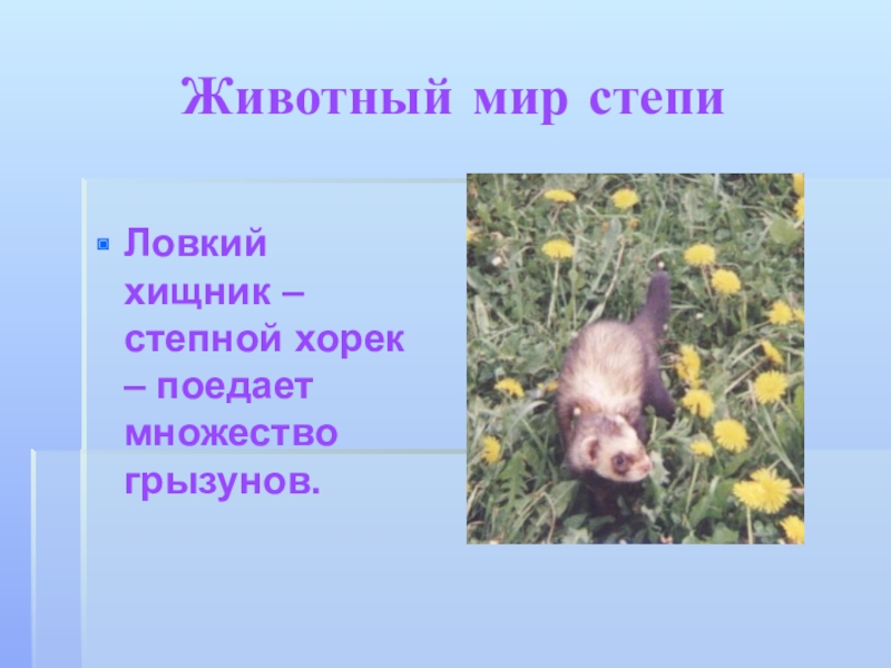 Животный мир степиЛовкий хищник – степной хорек – поедает множество грызунов.