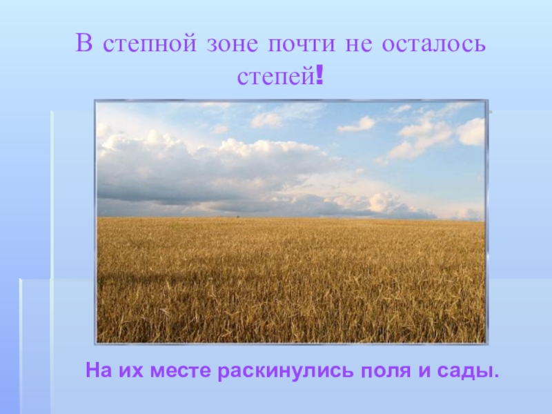 В степной зоне почти не осталось степей!На их месте раскинулись поля и сады.