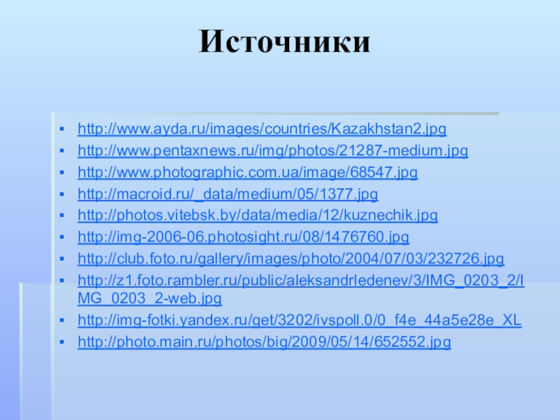 Источникиhttp://www.ayda.ru/images/countries/Kazakhstan2.jpghttp://www.pentaxnews.ru/img/photos/21287-medium.jpghttp://www.photographic.com.ua/image/68547.jpghttp://macroid.ru/_data/medium/05/1377.jpghttp://photos.vitebsk.by/data/media/12/kuznechik.jpghttp://img-2006-06.photosight.ru/08/1476760.jpghttp://club.foto.ru/gallery/images/photo/2004/07/03/232726.jpghttp://z1.foto.rambler.ru/public/aleksandrledenev/3/IMG_0203_2/IMG_0203_2-web.jpghttp://img-fotki.yandex.ru/get/3202/ivspoll.0/0_f4e_44a5e28e_XLhttp://photo.main.ru/photos/big/2009/05/14/652552.jpg