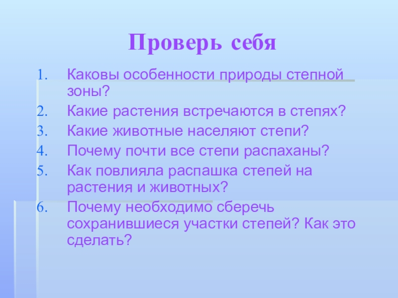 Проверь себяКаковы особенности природы степной зоны?Какие растения встречаются в степях? Какие животные населяют степи?Почему почти все степи