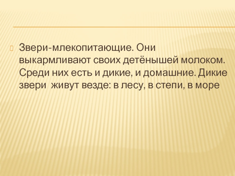 Слайд 11Звери-млекопитающие. Они выкармливают своих детёнышей молоком. Среди них есть и дикие,