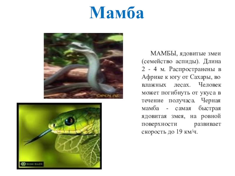 МАМБЫ, ядовитые змеи (семейство аспиды). Длина 2 - 4 м. Распространены