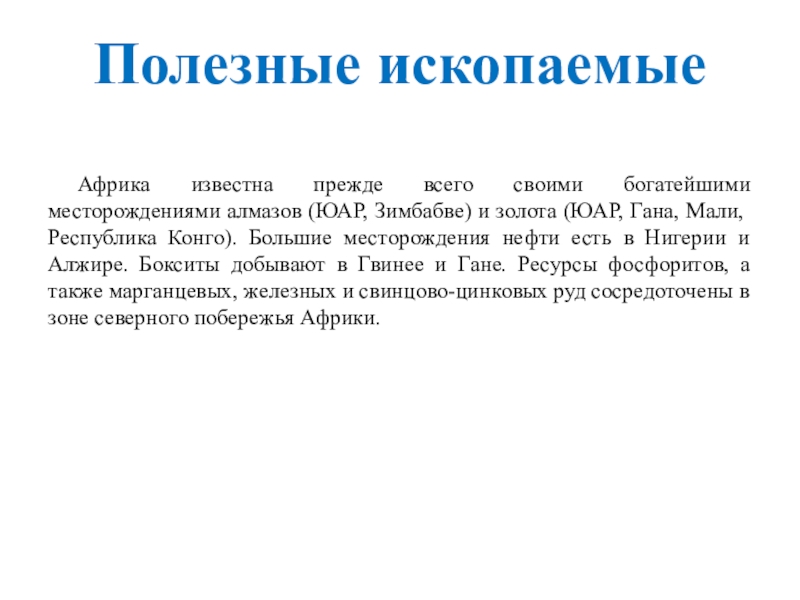 и золота (ЮАР, Гана, Мали, Республика Конго). Большие месторождения нефти есть в Нигерии и Алжире. Бокситы добывают в Гвинее и Гане. Ресурсы фосфоритов, а также марганцевых, железных и свинцово-цинковых руд сосредоточены в зоне северного побережья Африки.